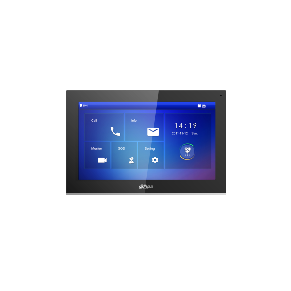 10-инчов цветен IP TFT капацитивен touch монитор за видеодомофонна система. Резолюция 1024х600. Поддържа Intercom връзка. Вграден високоговорител и микрофон. Двупосочно аудио. Поддържка на IP камери Dahua. Алармени фукции с 6x алармени входа, 1x алармен изход. Ethernet RJ-45 порт 10/100Mps. 6x безжични зони за детектори Dahua 433MHz. вградена MicroSD карта 8GB. Протоколи: SIP2.0, VT, TCP/IP, компресия H.264/G.711, PCM. Захранване DC12V/7W; POE 802.3af. Работна темп.: -10~55ºC. Метален корпус. Подходящ за повърхностен монтаж. Размери: 260 mm × 170 mm × 28 mm.