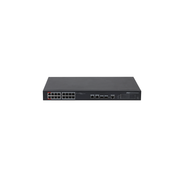 18-портов управляем/WEB Managed Layer-2  POE суич оптимизиран за системи за видеонаблюдение. 16 порта х 10/100Base-TX POE, Combo 2 x uplink порт x 10/100/1000Base-T, Combo 2 x Оптичен порт 1000Base-X. POE protocol IEEE802.3af, IEEE802.3at, максимална мощност на порт 1&2: 90W, максимална мощност на порт 3÷16: 30W. Обща мощност 240W, POE-Management & Statistics. Комутираща способност: 8,8Gbps. Поддържани протоколи: VLAN 802.1Q, STP, RSTP, Port Aggregation: Static link & LACP, Port Mirroring, DCHP-client, Flow Control: Half & Full-duplex, IP & Mac binding, IEEE802.1x, QoS: 802.1P, SNMP V1/2C/3. Extended Mode 250m POE. Работна температура -10ºC~55ºC. Вградена гръмозащита 4kV/2kV.  Размери: 440х300х44mm, Rack-mount. Захранване: AC100~240V.