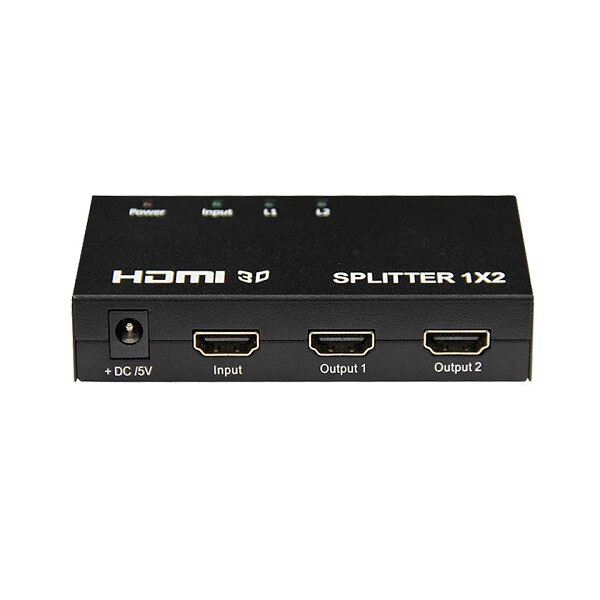 HDMI дистрибутор 1x вход/2x изхода. Максимална резолюция 1920х1080@50/60Hz. Поддържа: HDMI1.4а, 3D. Захранване DC5V/850mA. Размери: 86х46х25mm. Комплект с адаптер.