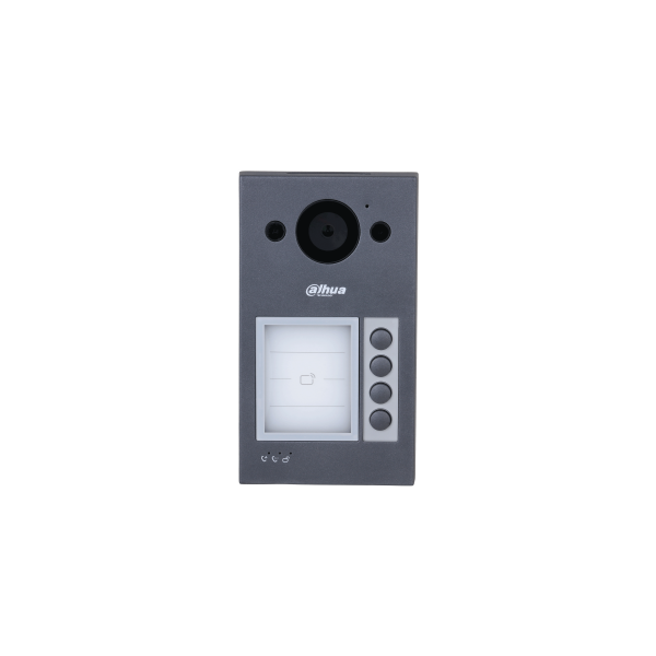 IP Външно вандалоустойчиво видеодомофонно устройство за 4 абоната с 2 Mpix True Day/Night TrueWDR 120dB, ICR 1/2.8” CMOS камера с висока светлочувстителност и хоризонтален ъгъл 125º и вградена подсветка. Опция за син и червен лицев панел. Картов четец за IC 13.56Mhz карти, памет за 3000 карти. Ethernet RJ-45 порт 10/100Mps TCP/IP или двупроводна линия. Управление през Android/iOS приложение DMSS Plus. Дистанционно отваряне на врата. 1x вход за exit бутон, 1x вход за статус, 1x RS485. 1x Слот за MicroSD карта до 256GB. Протоколи: SIP2.0, TCP/IP, компресия H.264/G.711. Захранване DC48V/1A, POE 802.3af или комутатор за двупроводна линия. Работна температура: -40~60ºC. Подходящ за повърхностен монтаж. Водо и вандалоустойчив алуминиев корпус, IP65(С допълнително силиконизиране)/IK08. Размери: 188.1 mm × 107.2 mm × 30 mm.