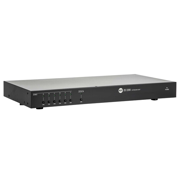 Модул за разширение на мулти-зонова система с 6-зони . Възможност за разширение до 54 зони посредством свързване в схема daisy chain на 8 броя ZE 2200. 1x изход за каскадно разширение с ZE 2200. 1x RCA AUX вход. 9x програмируеми входа DC24V. 10x NO изхода. 1x RCA PreOut, 1x NO/NC релеен статус изход, 6 зони с изходи висок импеданс: 16Ω/70V, 31Ω/100V. 1x DC24V/800mA изход. Регулиране ниво на всяка зона и Master volume, Регулиране нивото на Ниски, Високи честоти. Защита на изходите от к.с. и претоварване. Захранване 220-240VAC, 50-60Hz/Emergency DC24V/720W. Размери 19“ 1U 430х365х44mm, тегло 3.3kg.