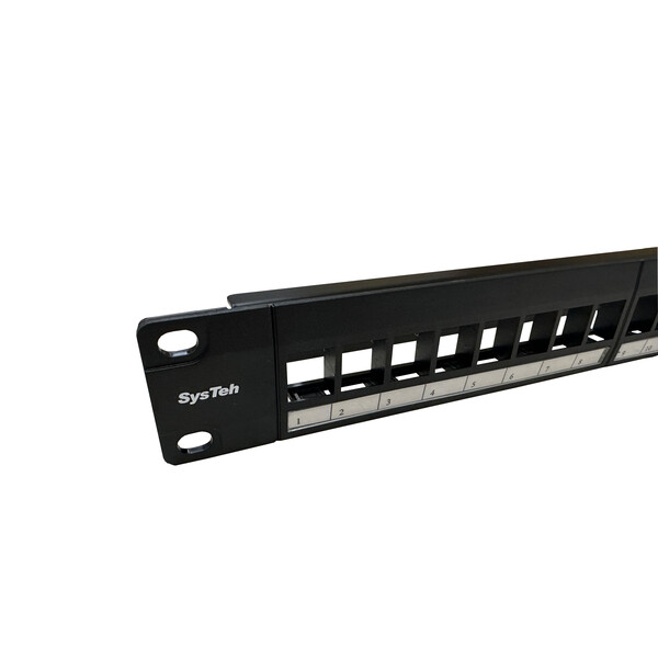 Пач панел - незареден, 24 портов, неекраниран. Етикети за надписване. 19" монтаж, комплект с крепежи и кабелни връзки.